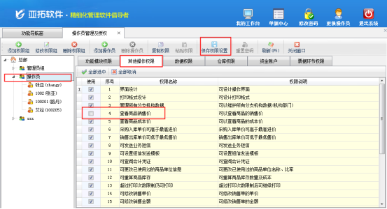 以亞拓管理軟件專業(yè)版本為例,首先打開系統(tǒng)管理—》操作員及授權(quán),選擇一個(gè)操作員組,設(shè)置其他操作權(quán)限中的“查看商品銷售價(jià)”不勾選。然后保存權(quán)限。如下圖1所示: