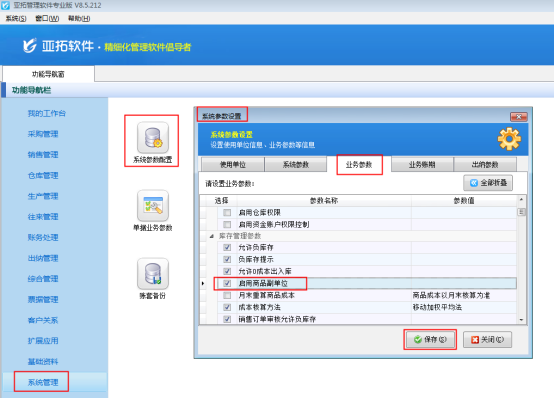 在功能導(dǎo)航窗中點擊“系統(tǒng)管理”—》“系統(tǒng)參數(shù)配置”,即可進入“系統(tǒng)參數(shù)設(shè)置”界面,點擊“業(yè)務(wù)參數(shù)”,如圖1所示,在庫存管理參數(shù)內(nèi)找到“啟用商品副單位”參數(shù),勾選這個參數(shù),然后保存。