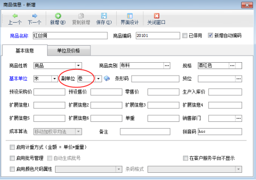 啟用商品副單位后,在商品信息中可以維護副單位。在功能導(dǎo)航窗點擊“基礎(chǔ)資料”—》“商品信息”,新增商品窗口選擇商品副單位,如圖2所示。