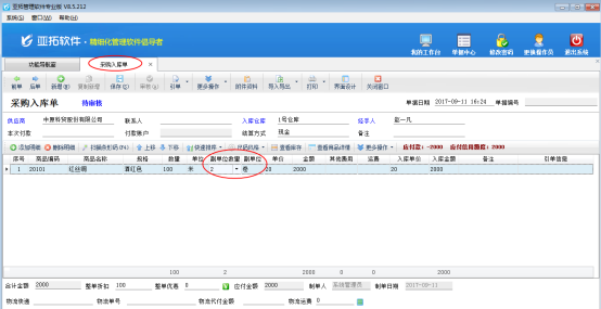 商品保存后,在功能導(dǎo)航窗點擊“采購管理”—》“采購入庫單”,新增采購入庫單,在業(yè)務(wù)單據(jù)明細中可以輸入副單位的數(shù)量,如圖3所示。