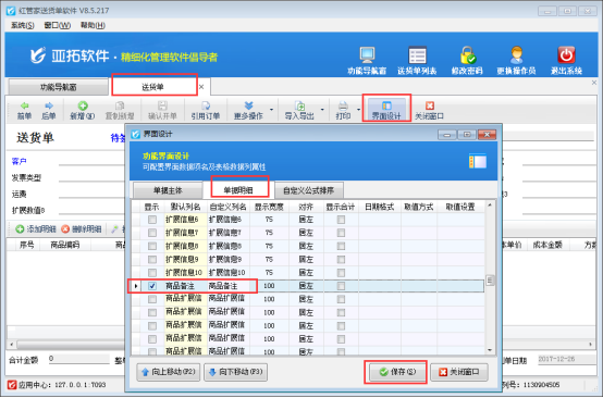 商品備注信息也支持通過(guò)Excel導(dǎo)入。商品備注信息維護(hù)好后,下邊我們示范下如何在開(kāi)單界面顯示出商品備注信息,在功能導(dǎo)航窗打開(kāi)“業(yè)務(wù)處理”—》“新開(kāi)送貨單”在送貨單界面打開(kāi)“界面設(shè)計(jì)”,在界面設(shè)計(jì)的單據(jù)明細(xì)中勾選上“商品備注”數(shù)據(jù)項(xiàng),然后保存界面設(shè)計(jì)。如下圖2所示:
