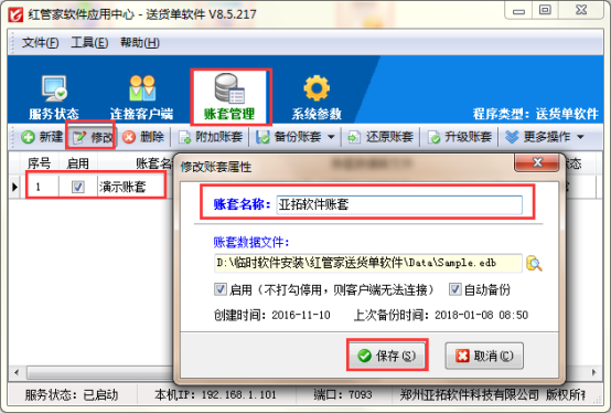以“紅管家送貨單軟件”為例,示范下如何修改賬套的名稱。打開紅色的應用中心程序(如已打開可在桌面右下角尋找下紅色圖標),在賬套管理界面,點擊賬套后選擇工具欄中的修改按鈕,彈出修改賬套名稱界面,把“演示賬套”修改為“亞拓軟件賬套”然后點擊“保存”按鈕,如下圖1所示: