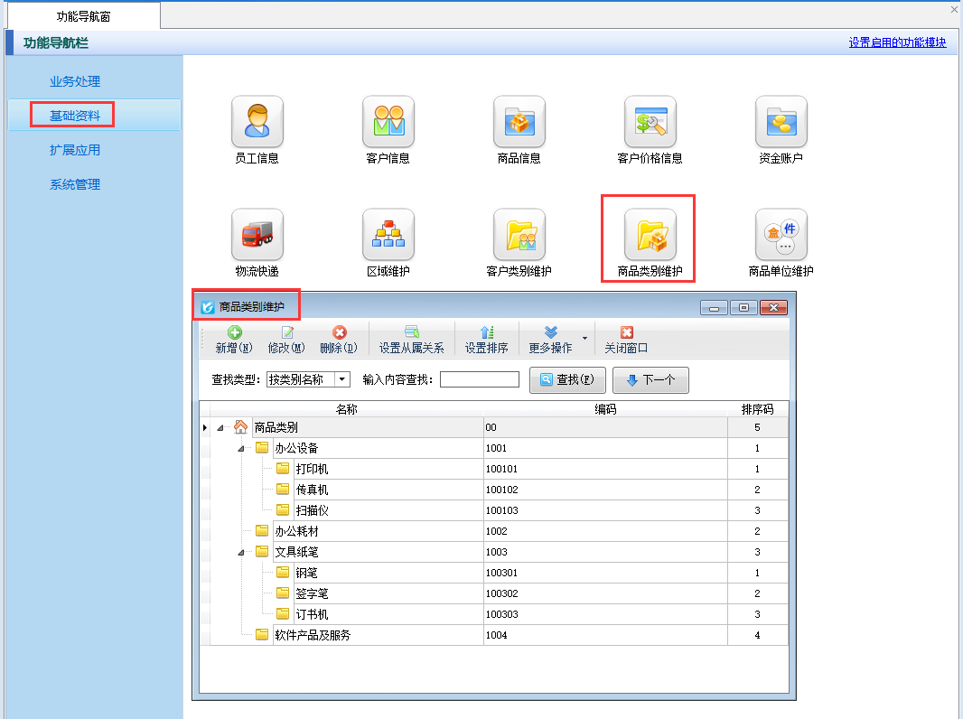 在功能導航窗點擊“基礎資料”—》“商品類別維護”即可打開“商品類別維護”窗口,如圖1所示,在“商品類別維護”窗口可以進行新增、修改、刪除、設置從屬關系、導入導出商品類別等操作。