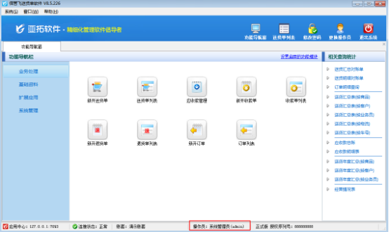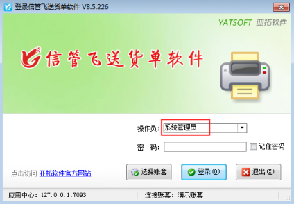 亞拓管理軟件信管飛送貨單軟件信管飛倉庫管理軟件信管飛出納記賬軟件、信管飛票據打印軟件等安裝后默認登錄的操作員為“系統管理員”,如圖1、圖2所示。部分用戶在使用軟件時需要將“系統管理員”修改為自己的名字,在軟件內如何修改呢?本篇文章以信管飛送貨單軟件為例詳細介紹一下如何修改“系統管理員”名字?