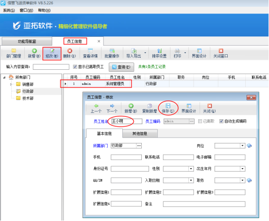 在功能導航窗點擊“基礎資料”——》“員工信息”,打開員工信息界面,選擇“系統管理員”,點擊“修改”按鈕,如圖3所示,將“系統管理員”修改為“王小明”,修改之后點擊“保存”按鈕。然后重新登錄軟件時,即可看到“系統管理員”已更改為“王小明”,如圖4所示。
