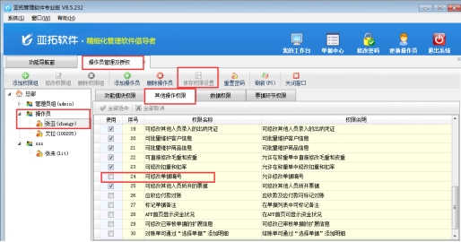 以亞拓管理軟件專業版為例,示范下如何設置操作員不能修改單據編號的權限。在功能導航窗選擇“系統管理”—》“操作員及授權”進入操作員管理及授權界面。選擇操作員組的操作員“張亞”,點擊右側功能權限設置模塊,點擊“其他操作權限”,在下邊的權限中找到“可修改單據編號”,把勾選“√”符號取消(鼠標單擊即可取消)。點擊保存權限設置。如下圖1所示:
