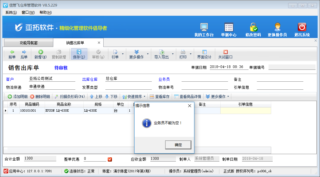 以信管飛倉庫管理軟件為例,示范下如果設(shè)置開銷售單時(shí)業(yè)務(wù)員允許為空。軟件安裝完成,系統(tǒng)參數(shù)設(shè)置默認(rèn)業(yè)務(wù)員不允許為空,正常開銷售單,未在單據(jù)主體中輸入“業(yè)務(wù)員”,商品輸入完成后點(diǎn)擊“保存”按鈕,會(huì)提示“業(yè)務(wù)員不能為空”,如下圖1所示: