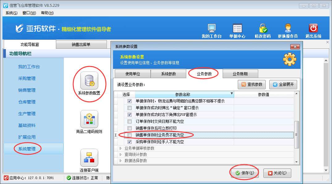 信管飛送貨單軟件、亞拓管理軟件、信管飛倉庫管理軟件等支持開銷售單時(shí)輸入業(yè)務(wù)員以區(qū)分單據(jù)是誰所開的,也有客戶開單的時(shí)候不需要輸入業(yè)務(wù)員,對于不需要輸入業(yè)務(wù)員的需求,軟件支持設(shè)置系統(tǒng)參數(shù)來進(jìn)行控制業(yè)務(wù)員是否允許為空。