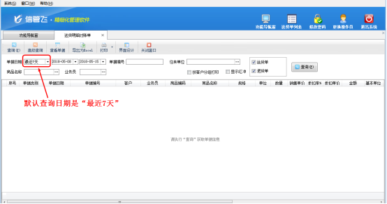 信管飛送貨單軟件信管飛RMS(進銷存軟件)、信管飛倉庫管理軟件內都包含了統計查詢功能(單據匯總表、單據明細表等統計查詢報表),軟件內統計查詢功能默認的查詢日期為“最近7天”(如下圖1所示),但是如果需要修改默認查詢日期,該如何修改呢?下面我們以信管飛送貨單軟件為例詳細介紹下軟件內如何修改默認查詢日期。