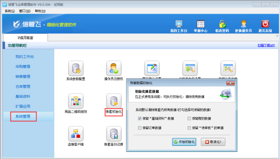 信管飛倉(cāng)庫(kù)管理軟件、信管飛RMS、信管飛送貨單軟件等都支持對(duì)賬套進(jìn)行初始化操作,下邊以“信管飛倉(cāng)庫(kù)管理軟件”為例來(lái)演示下具體的操作步驟。