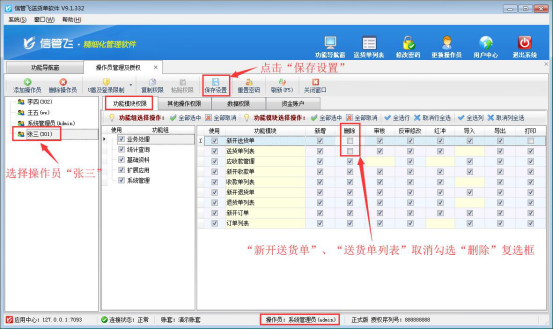 登錄軟件,在功能導(dǎo)航窗點(diǎn)擊“系統(tǒng)管理”—》“操作員及授權(quán)”,進(jìn)入“操作員管理及授權(quán)”界面,選擇操作員“張三”,在其右側(cè)的功能模塊權(quán)限內(nèi)選擇“業(yè)務(wù)處理”模塊,將“新開送貨單”和“送貨單列表”的“刪除”權(quán)限取消勾選,然后保存設(shè)置,如圖2、圖3所示。