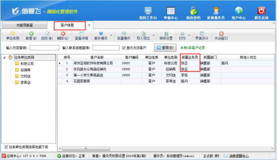 首先需要先設(shè)置下客戶資料的所屬業(yè)務(wù)員,在功能導(dǎo)航窗選擇“基礎(chǔ)資料”—》“客戶信息”在客戶信息界面,設(shè)置客戶的所屬業(yè)務(wù)員,本文以操作員“張亞”為例,如下圖所示:
