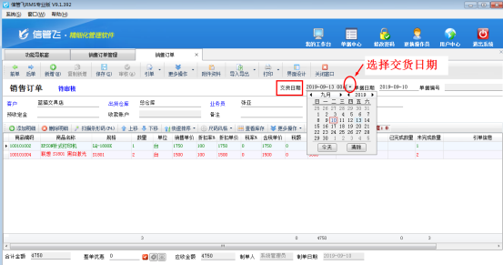 在功能導航窗點擊“銷售管理”—》“銷售訂單”,新增銷售訂單,訂單界面可以錄入交貨日期,如下圖所示:
