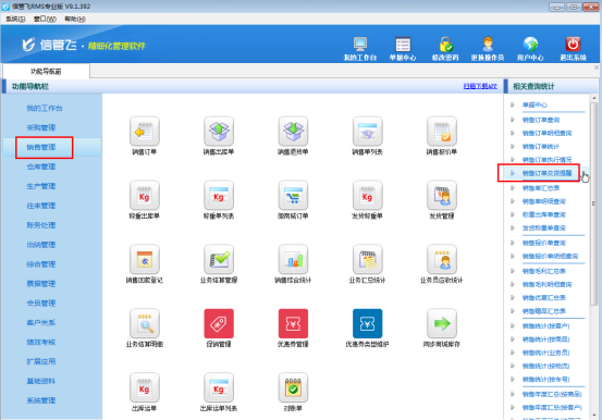 在功能導航窗點擊“銷售管理”,銷售管理模塊最右側相關查詢統(tǒng)計內打開“銷售訂單交貨提醒”,如下圖所示: