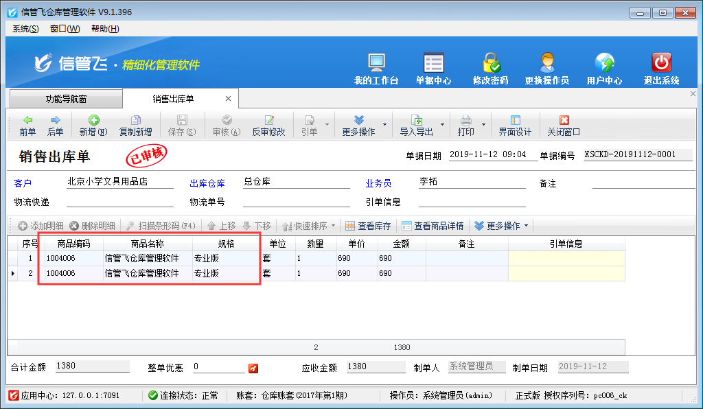 信管飛送貨單軟件、信管飛倉庫管理軟件、信管飛RMS等軟件在新開業(yè)務(wù)單據(jù)時(shí)默認(rèn)在單據(jù)明細(xì)內(nèi)支持同一商品可添加多條記錄(如下圖所示),部分用戶在開單時(shí)需要設(shè)置在單據(jù)明細(xì)中同一商品不可錄入多行?該如何設(shè)置呢?本篇文章我們以信管飛倉庫管理軟件為例來介紹一下如何設(shè)置開單時(shí)單據(jù)明細(xì)中同一商品不可錄入多行。