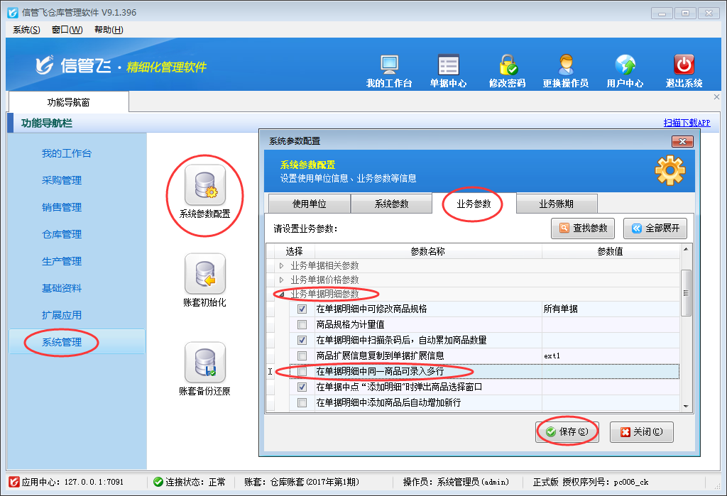 在功能導(dǎo)航窗點(diǎn)擊“系統(tǒng)管理”—》“系統(tǒng)參數(shù)配置”—》“業(yè)務(wù)參數(shù)”,即可進(jìn)入到“業(yè)務(wù)參數(shù)”配置界面,在業(yè)務(wù)單據(jù)明細(xì)參數(shù)內(nèi)找到“在單據(jù)明細(xì)中同一商品可錄入多行”參數(shù),把這個(gè)參數(shù)的勾選去掉,然后保存,如下圖所示。