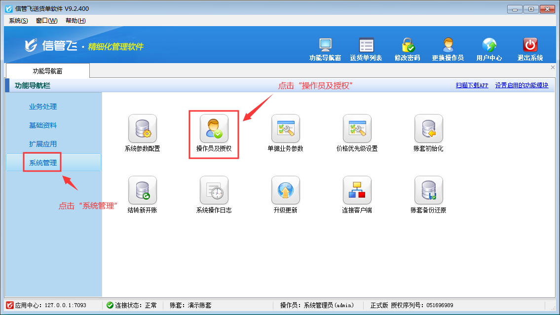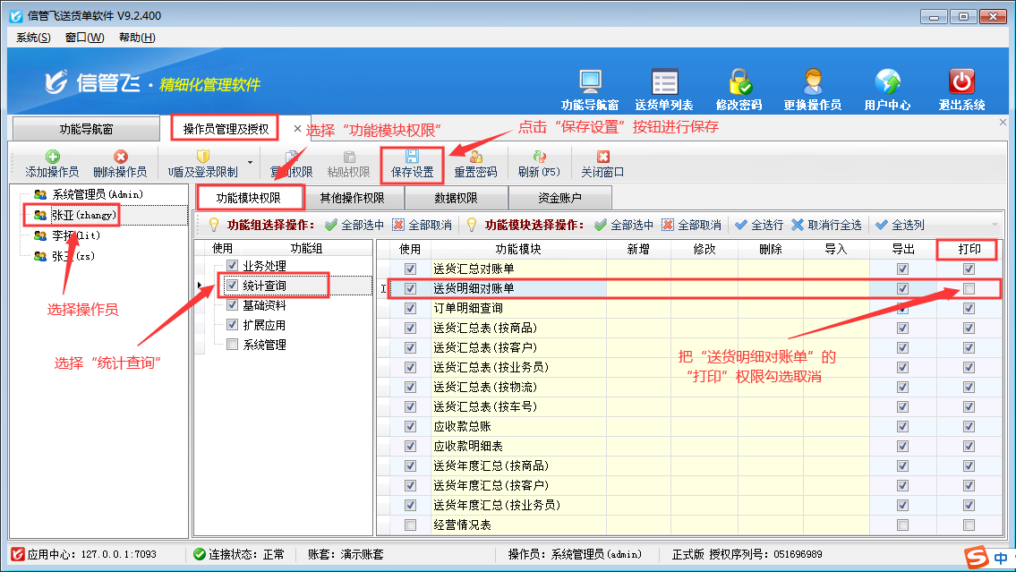 登錄軟件,在功能導(dǎo)航窗點(diǎn)擊“系統(tǒng)管理”—》“操作員及授權(quán)”,進(jìn)入“操作員管理及授權(quán)”界面,選擇操作員“張亞”,在其右側(cè)的功能模塊權(quán)限內(nèi)選擇“統(tǒng)計(jì)查詢”模塊,將送貨明細(xì)對賬單的“打印”權(quán)限勾選取消,然后保存設(shè)置,如下圖所示: