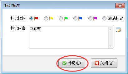 在“標(biāo)記備注”窗口選擇標(biāo)記旗幟,錄入標(biāo)記內(nèi)容,然后點(diǎn)擊“標(biāo)記”按鈕即可標(biāo)記單據(jù)備注。