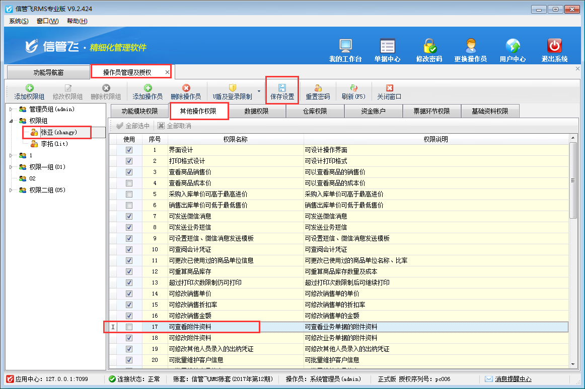 在功能導(dǎo)航窗點擊“系統(tǒng)管理”—》“操作員及授權(quán)”打開操作員管理及授權(quán)界面,選擇操作員“張亞”,在“其他操作權(quán)限”中把權(quán)限“可查看附件資料”勾選取消,然后點擊“保存設(shè)置”按鈕保存權(quán)限設(shè)置,如下圖所示: