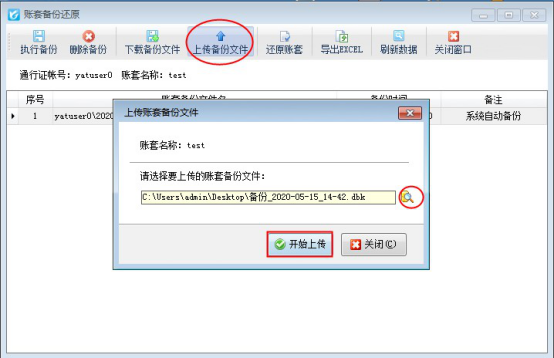 在賬套備份還原界面,點擊“上傳備份文件”,可選擇本地的備份文件(.dbk格式),進行上傳,如下圖所示: