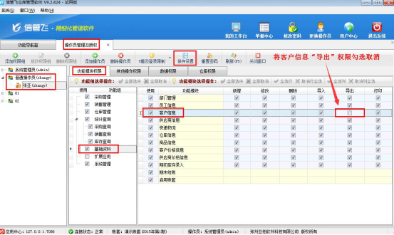 在功能導(dǎo)航窗點擊“系統(tǒng)管理”—》“操作員及授權(quán)”打開操作員管理及授權(quán)界面,選擇操作員“張亞”,在功能模塊權(quán)限界面,選擇“基礎(chǔ)資料”—》“客戶信息”,在導(dǎo)出權(quán)限下,把客戶信息“導(dǎo)出”權(quán)限勾選取消后保存權(quán)限,如下圖1所示: