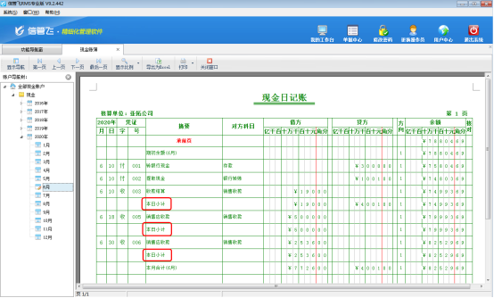 系統(tǒng)進(jìn)入“現(xiàn)金賬簿”窗口,在窗口左側(cè)的導(dǎo)航樹(shù)中,所有現(xiàn)金帳戶可以按年按月顯示帳簿信息,我們點(diǎn)擊查看2020年6月的現(xiàn)金賬簿信息,如圖3所示,這是現(xiàn)金賬簿顯示本日小計(jì)的效果圖。