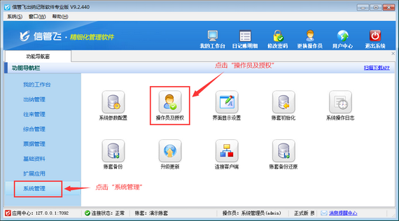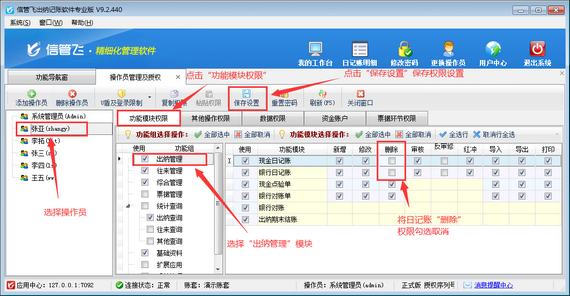 如果需要操作員不可刪除日記賬憑證,軟件也支持設(shè)置操作員不可刪除日記賬憑證權(quán)限,下面以信管飛出納記賬軟件專業(yè)版為例來演示一下設(shè)置操作員不可刪除日記賬憑證權(quán)限操作步驟。