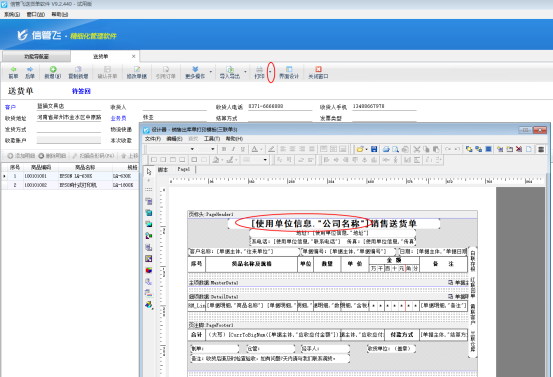 然后打開一個送貨單,點擊“打印”—》“打印格式設(shè)計”,選擇打印模板點擊“設(shè)計格式”進入設(shè)計格式界面,單位名稱調(diào)用系統(tǒng)參數(shù)的[使用單位信息."公司名稱"],如下圖2所示: