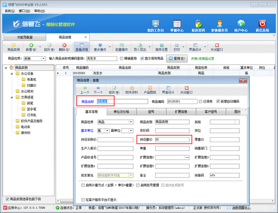 信管飛RMS信管飛送貨單軟件等都支持開單前錄入好商品的預設價格,如預設采購價、預設售價等,方便開單選擇商品時自動獲取價格信息。如下圖所示,設置商品“洗發水”預設售價50元/瓶,以信管飛RMS進銷存管理軟件)為例示范一下如何設置銷售開單時自動取商品預設售價?