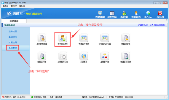 登錄軟件,在功能導(dǎo)航窗點(diǎn)擊“系統(tǒng)管理”—》“操作員及授權(quán)”,進(jìn)入“操作員管理及授權(quán)”界面,選擇操作員“張亞”,在其右側(cè)的功能模塊權(quán)限內(nèi)選擇“統(tǒng)計(jì)查詢”模塊,將送貨明細(xì)對(duì)賬單的“導(dǎo)出”權(quán)限勾選取消,然后保存設(shè)置,如下圖所示: