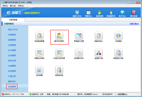 登錄軟件,在功能導航窗點擊“系統管理”—》“操作員及授權”,進入“操作員管理及授權”界面,選擇操作員“張亞”,在其右側的功能模塊權限內選擇“生產管理”模塊,將生產模板BOM的“反審修改”權限勾選取消,然后保存設置,如下圖所示。