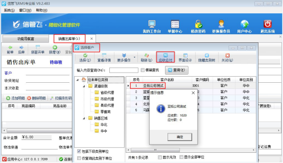 參數(shù)保存完成后,在銷售管理中新開銷售出庫單,選擇客戶界面可查詢當(dāng)前客戶的應(yīng)收款情況,如下圖所示: