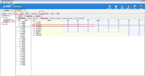 在功能導航窗點擊“系統管理”—》“操作員及授權”打開操作員管理及授權界面,選擇操作員“李拓”,在“功能模塊權限”中把“生產領料出庫單”權限對應的“審核”選項取消勾選,然后點擊“保存設置”按鈕保存權限設置,如下圖所示: