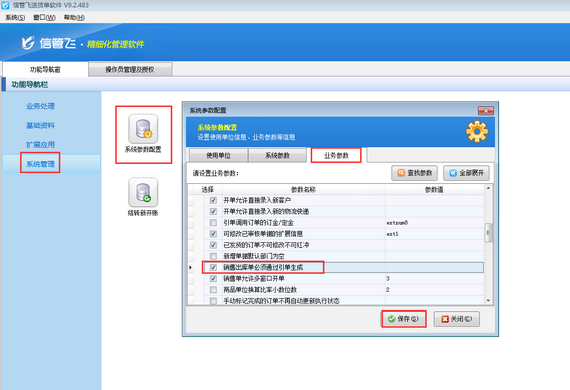 本文以“信管飛送貨單軟件”為例,示范如何設置送貨單必須通過引單生成。在功能導航窗選擇“系統管理”—》“系統參數配置”,在業務參數的“業務單據相關參數”中勾選啟用參數“銷售出庫單必須通過引單生成”,保存參數配置,如下圖所示: