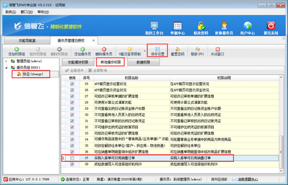 在功能導航窗點“系統(tǒng)管理”—》“操作員及授權”即可進入“操作員管理及授權”界面,選中操作員賬號,在“其他操作權限”界面將“采購入庫單可引用銷售訂單”權限打鉤取消,然后保存權限設置,如下圖所示,設置操作員張亞沒有“采購入庫單可引用銷售訂單”權限。