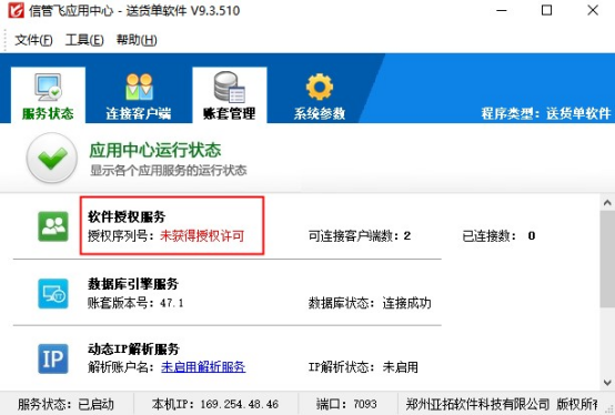 授權文件形式授權目前只有信管飛新架構軟件支持,如需要變更為授權形式,需升級到新版本。授權操作需在紅色應用中心程序上操作,操作如下:1、更換前加密鎖設備需拔出,拔出后應用中心程序授權服務的授權序列號會變為:未插入加密鎖,如下圖: