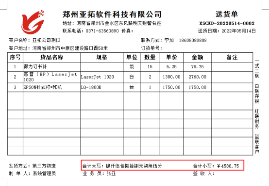 本文以“信管飛送貨單軟件”為例,示范下打印模板如何設(shè)置合計大寫金額取整顯示,新開一個送貨單,合計金額存在小數(shù),打印預(yù)覽圖如下: