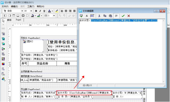 需要打印模板合計金額取整,在開單界面打印下點擊“打印格式設(shè)計”,選擇打印模板,點擊“設(shè)計格式”進(jìn)入模板設(shè)計器,小寫金額設(shè)置取整,可查看下邊的參考文章,大寫金額取整需要調(diào)用函數(shù),打開大寫合計文本框,復(fù)制取整調(diào)用數(shù)據(jù)項:[CurrToBigNum([RMRound([單據(jù)主體."應(yīng)收應(yīng)付金額"],0)])],然后確認(rèn)保存,如下圖: