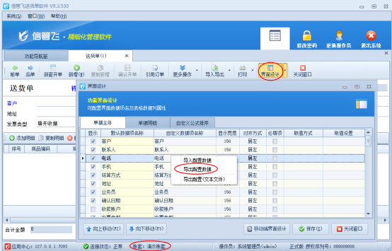 選擇已配置好的賬套(演示賬套)登錄軟件,配置如下圖1所示:功能導航窗點擊“業務處理”—》“新開送貨單”打開開單界面,工具欄點擊“界面設計”,點擊配置好的單據明細界面,在數據項處鼠標右鍵選擇“導出配置數據”可把配置數據導出到桌面上,文件為.dat格式,如下圖2所示: