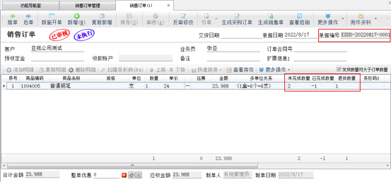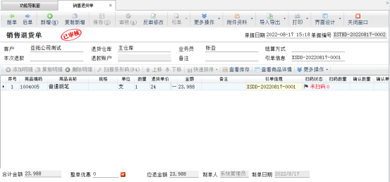 銷售退貨單引單訂單審核完成后,進(jìn)入銷售訂單管理界面,打開引單過的銷售訂單,可以看到訂單的完成數(shù)量以及退貨數(shù)量已更新。