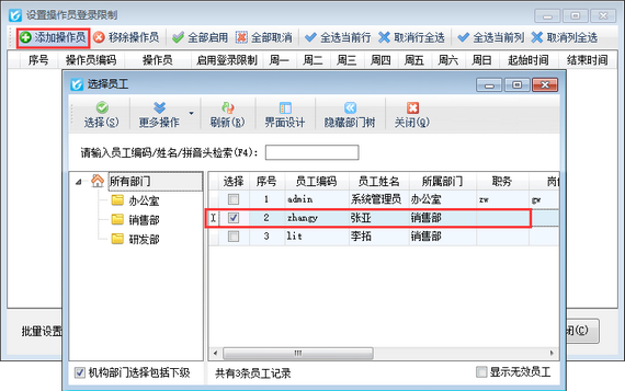 設置操作員登錄限制時,可以批量對多個操作員設置起始與結束時間。