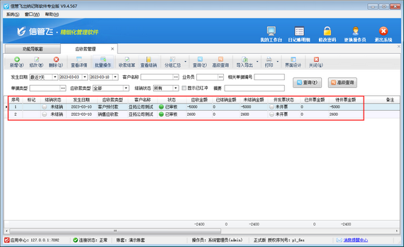 在功能導航窗點擊“往來管理”—》“應收款管理”打開應收款管理界面,如下圖所示,在應收款管理內對同一個客戶分別新增一個銷售應收款記錄,一個客戶預付款記錄,結銷狀態為“未結銷”狀態,已結銷金額為0