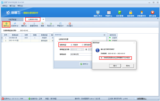 信管飛RMS軟件、信管飛倉(cāng)庫(kù)管理軟件最新版增加庫(kù)存月結(jié)功能,可按月或跨月進(jìn)行庫(kù)存結(jié)存,結(jié)存后可直接調(diào)整庫(kù)存數(shù)量及庫(kù)存成本。本文以信管飛RMS專業(yè)版為例示范下如果操作。