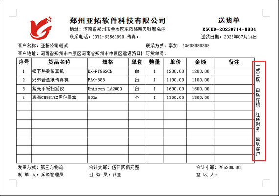 送貨單一般情況下是一式三聯(存根聯、財務聯、客戶聯),如下圖所示。有用戶需要打印一式二聯、一式四聯或者一式五聯,需要修改送貨單右側多聯單用途備注。軟件支持自定義修改,本文介紹一下操作方法。