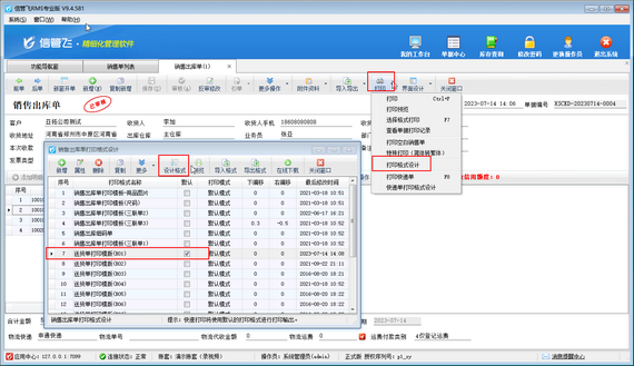 打開一個銷售出庫單,在單據界面工具欄點擊“打印”—》“打印格式設計”,在打開的打印格式設計窗口選擇需要調整的打印格式模板,然后點擊“設計格式”進入模板設計器,如下圖所示。