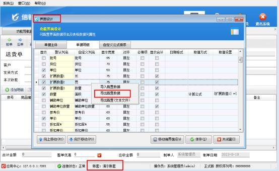 首先打開舊賬套“演示賬套”,功能導航窗點擊業務處理,打開“新開送貨單”界面,點擊工具欄界面設計,在界面設計界面鼠標單擊右鍵,彈出界面點擊“導出配置數據”,可導出配置文件至電腦桌面上,如下圖所示:
