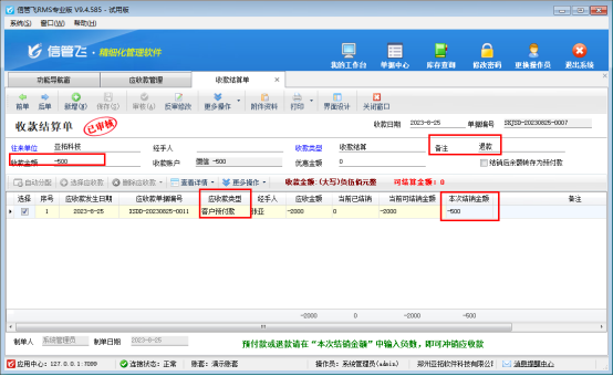 功能導(dǎo)航窗點擊往來管理—》應(yīng)收款管理,選擇客戶預(yù)付款,點擊工具欄收款結(jié)算,在收款結(jié)算單界面。收款金額和當(dāng)前可結(jié)銷金額輸入-500,可備注下退款,保存審核結(jié)算單就可以,如下圖所示:
