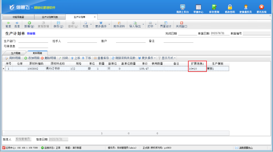 開單界面點(diǎn)生產(chǎn)明細(xì)添加需要生產(chǎn)的商品,該商品對應(yīng)的生產(chǎn)模板自動調(diào)用,此時用料明細(xì)界面可以看到對應(yīng)模板明細(xì)的擴(kuò)展信息已經(jīng)顯示出來了,如下圖所示。