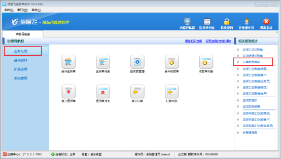在功能導航欄業務處理右側相關統計查詢下點擊“訂單明細查詢”,進入訂單明細查詢界面,如圖所示: