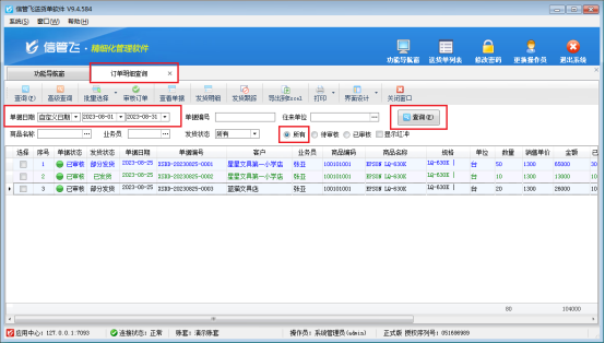 在訂單明細查詢界面支持自定義單據日期,比如需要導出8月份的訂單明細,自定義單據日期設置為8月1---8月31日,點擊查詢,顯示的結果是8月份所有的訂單明細,如圖所示: